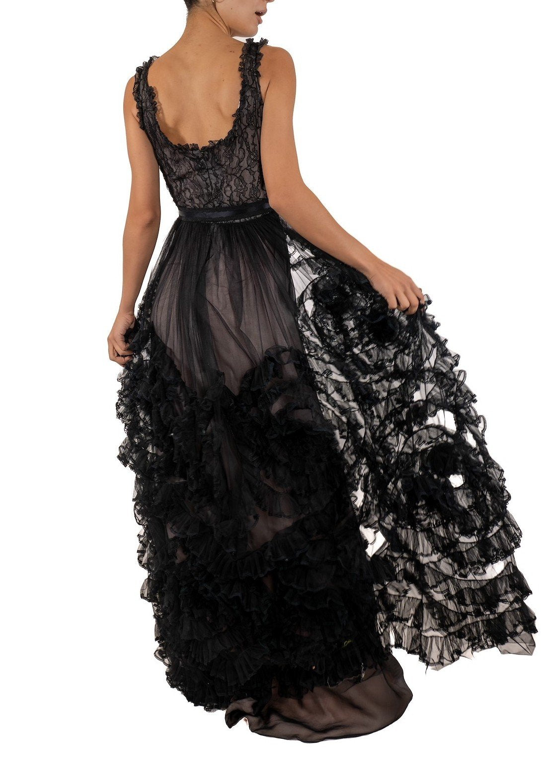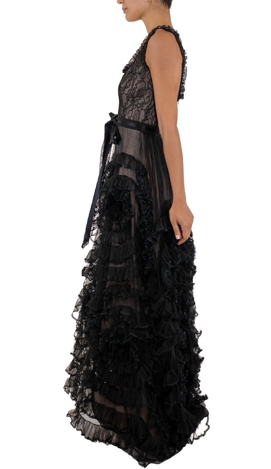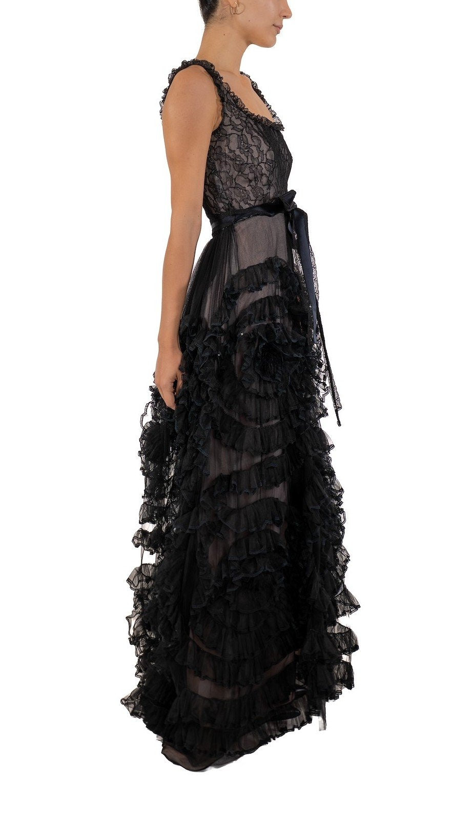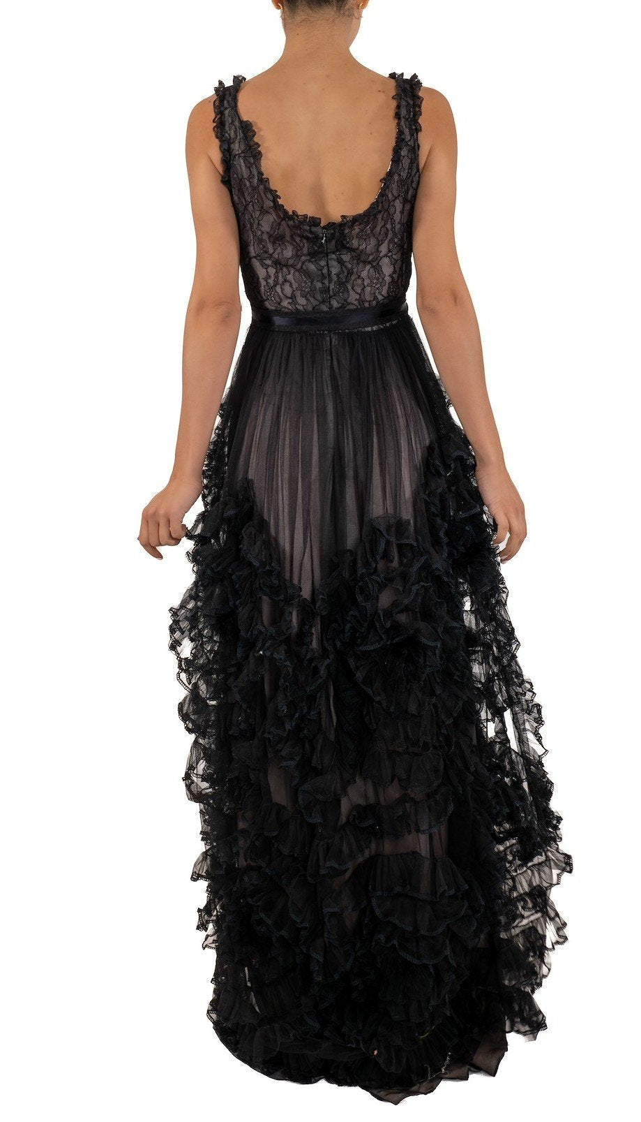 1990S Black Silk Chantilly Lace & Net Ruffled Ball Gown Lined In Lilac Charmeuse