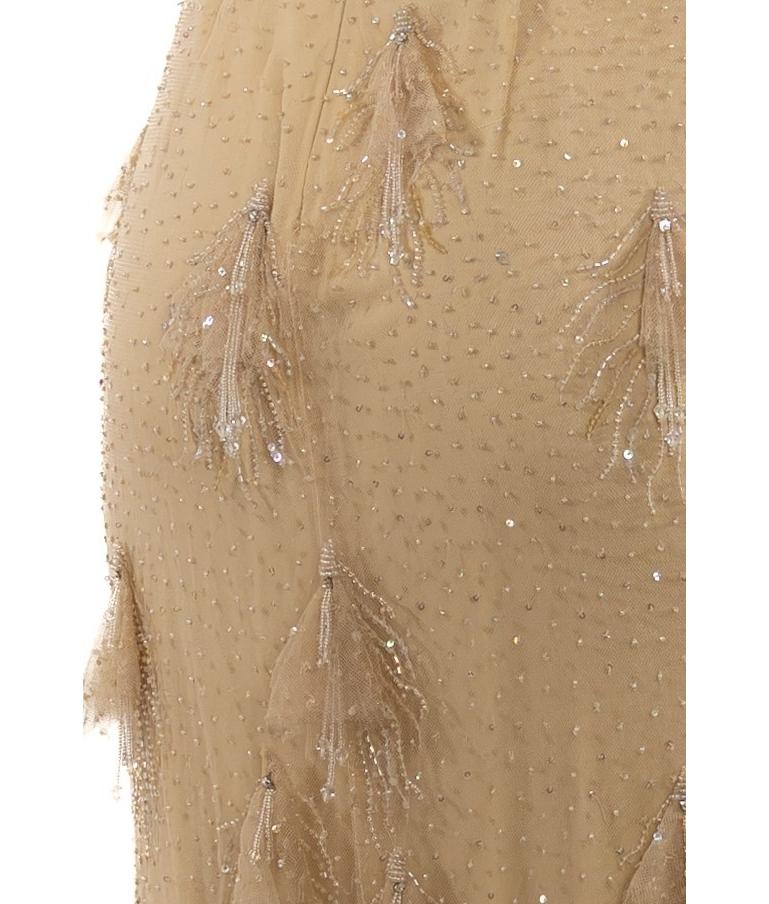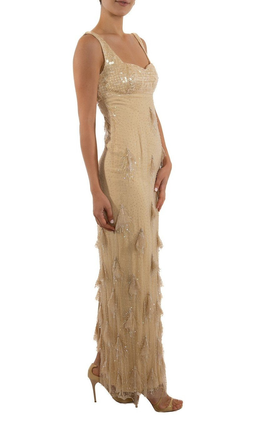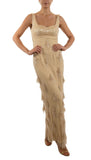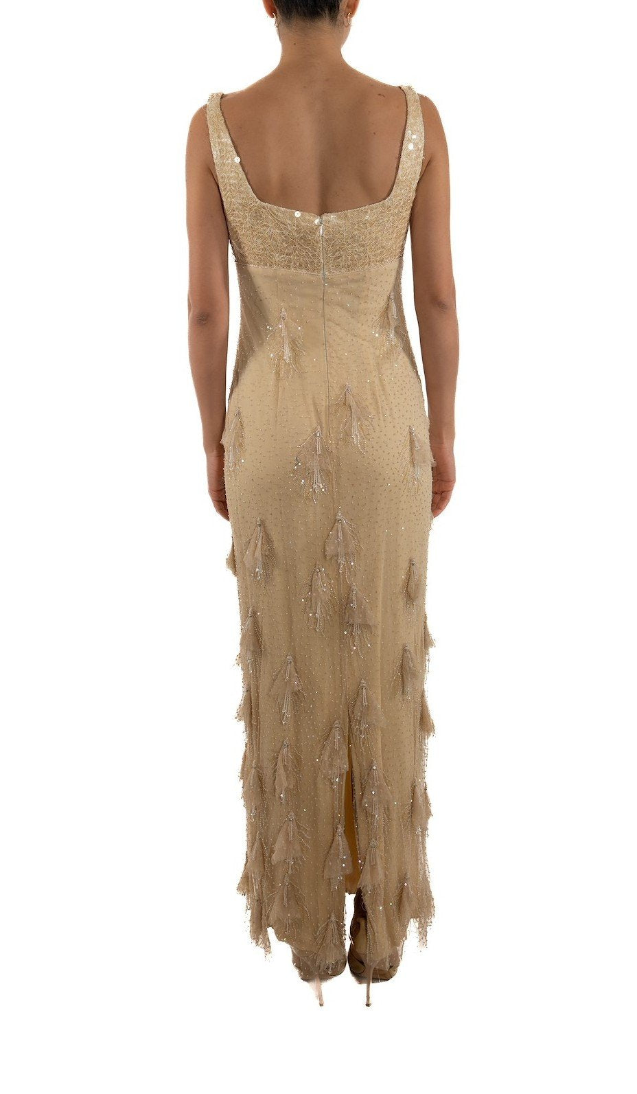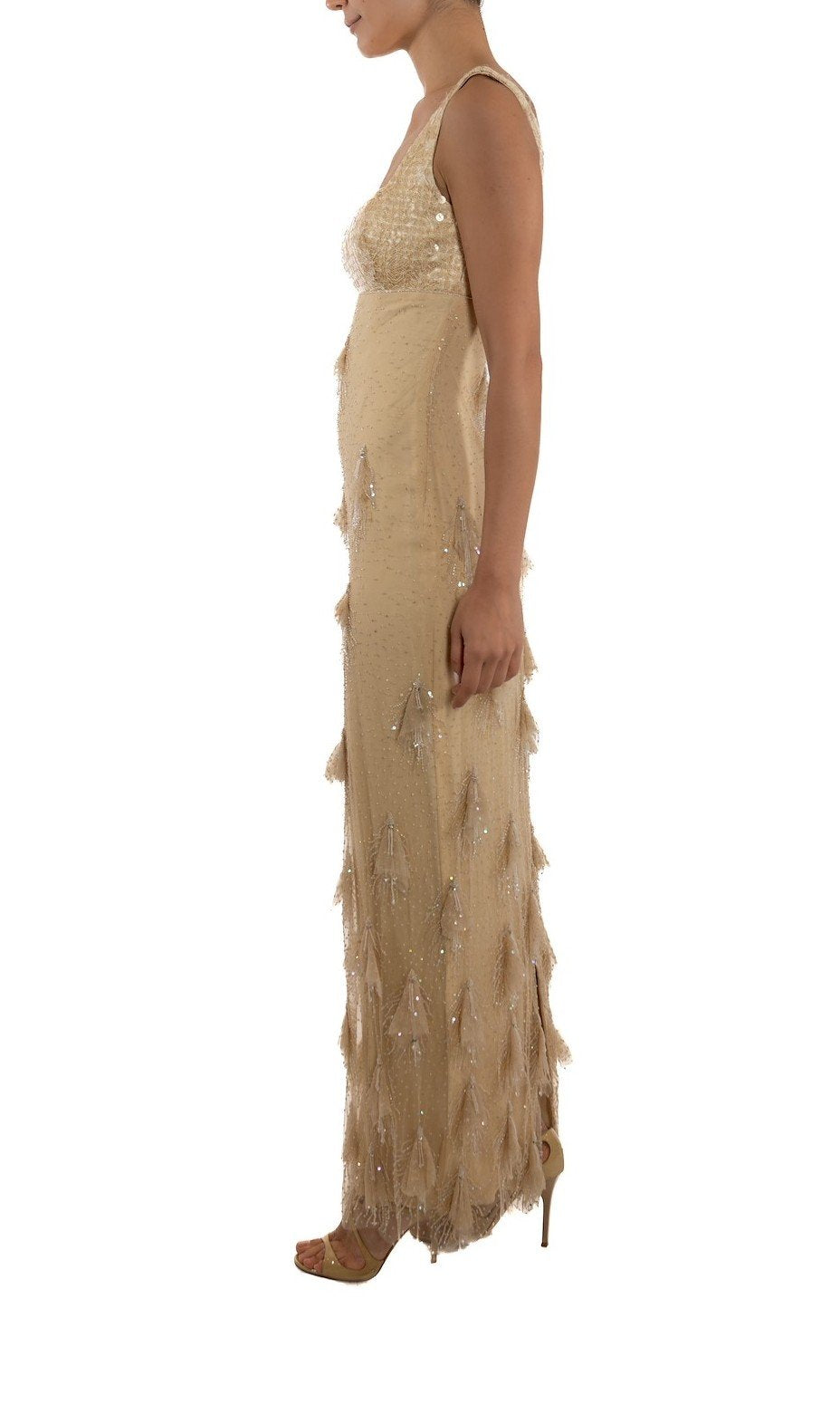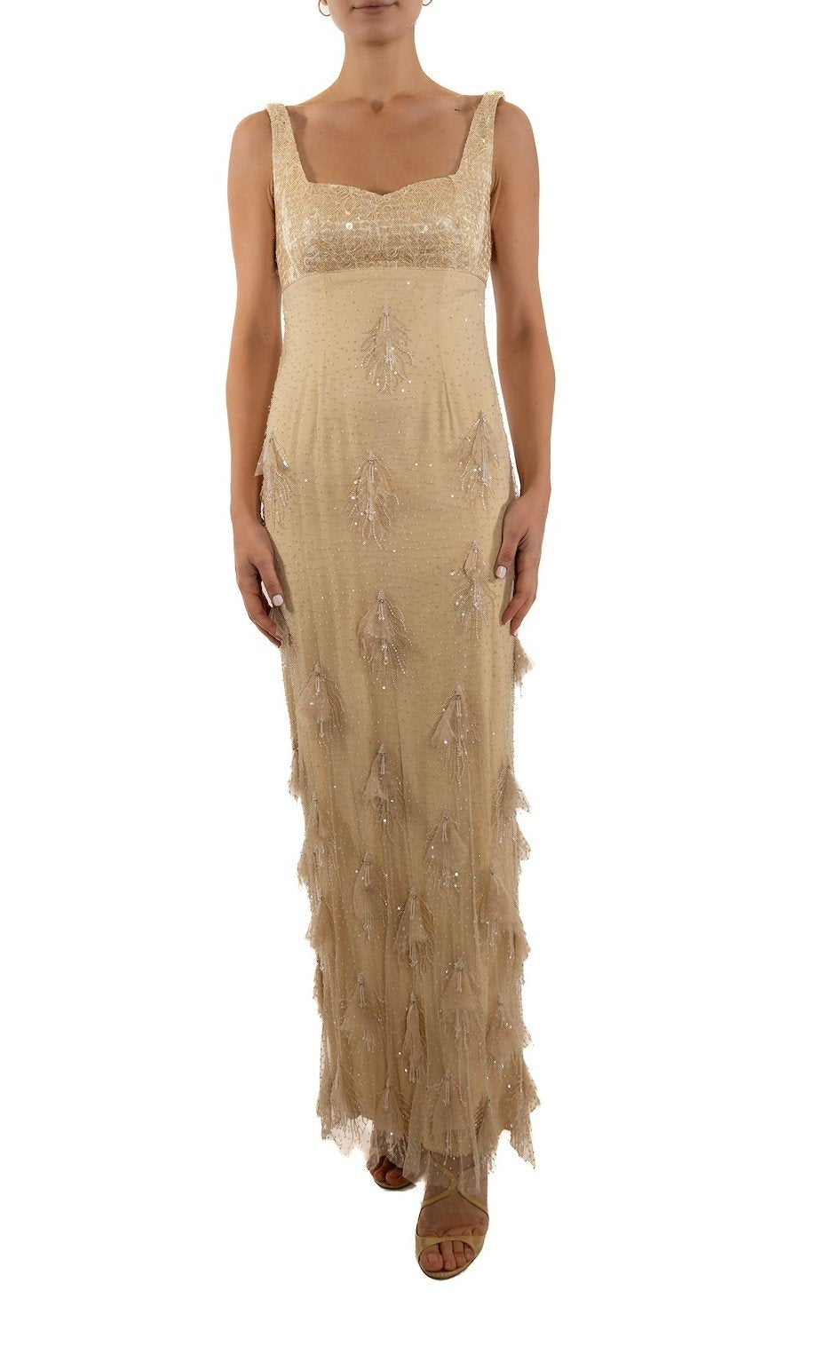 1990S Cream Beaded Silk & Lace Empire Waist Tassel Gown