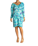 1980S YVES SAINT LAURENT Aqua Blue Silk Bow Print Dress With Ruffles