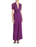 Late 30's Empire Waist Rayon Crepe Purple Dress with Gold Sequin Embellishment and belt. Good condition for the age.