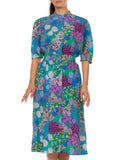 1970S Blue & Purple Polyester Psychedelic Floral Printed Dress With Hidden Skirt Pockets