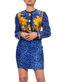 1990S GIANNI VERSACE Blue Baroque Leopard Print Skirt Suit With Gold Chain Hardware