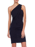 1990S YIGAL AZROUEL Navy Blue Rayon Slinky Jersey One Shoulder Cocktail Dress